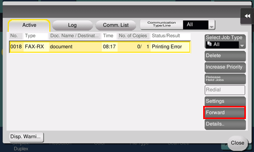 Select a job received using in-memory proxy reception, then tap [Forward].