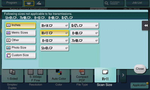 [Inches] | Select this option to scan an inch-size original. Tap [Inches], and select a standard inch size. |