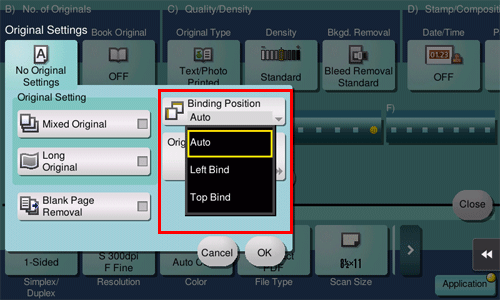 [Auto] | Automatically configures the binding position of the original. When the long side of the original is 11-11/16 inches (297 mm) or less, the binding position is set to the long side of the paper. When the long side of the original exceeds 11-11/16 inches (297 mm), the binding position is set to the short side of the paper. |
