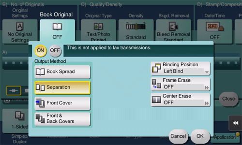 [Output Method] | Specify the scanning method for book spread originals.