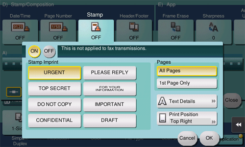 Text such as "PLEASE REPLY" and "DO NOT COPY" are printed on the first page or all pages. You can select the text to be added from the registered fix stamps and arbitrary registered stamps.