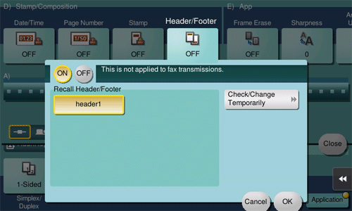 [Check/Change Temporarily] | If necessary, check or temporarily change the details of the program that is selected in [Recall Header/Footer].
