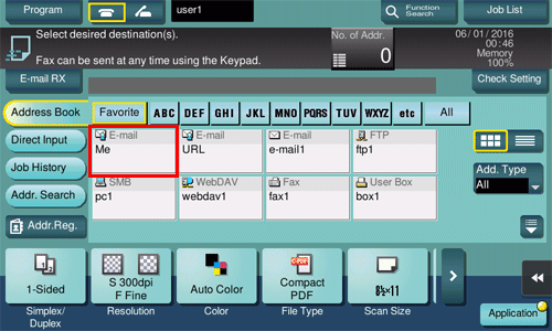 By selecting the [Me] key displayed in the [Address Book] screen, you can send E-mails to your E-mail address. If you log in to this machine that provides user authentication, the [Me] key appears in the [Address Book] screen. The [Me] key is assigned to an E-mail address of the login user. To use this function, you do not have to register your E-mail address in the address book.