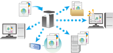 The scanned original data can be sent to a computer or server, and saved on the hard disk (User Box) of this machine.