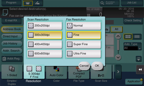 The finer the scan resolution is, the larger the data volume becomes, resulting in longer transmission time. To use an E-mail as a transmission method such as Scan to E-mail or Internet fax transmission, check that the data capacity are not limited.