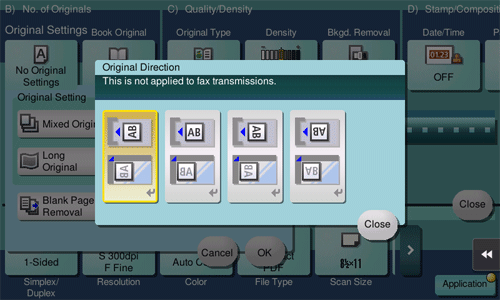 Select the stamping position and representation, and add the date and time the original is scanned. The date and time can be printed either on all pages or only on the first page.