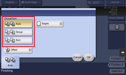 [Auto] | Automatically switches between Sort and Group according to the number of printed sheets for each set, and feeds out. If the number of printed sheets for each set is 1, the Group function is applied. If the number is 2 or larger, the Sort function is applied. |