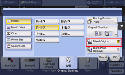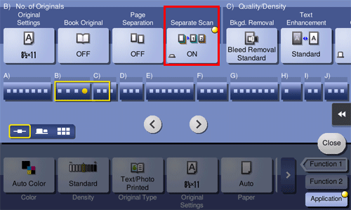 Originals are scanned with different settings for each set, and copied collectively. Use this function when various types of originals are mixed, such as 1-sided original to be printed on one side of paper, and 2-sided original to be copied by enlarging.