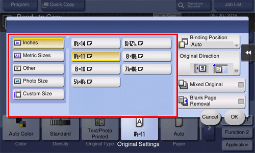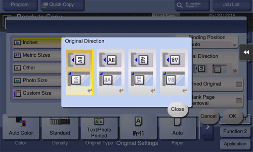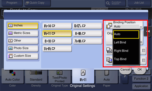 [Auto] | Automatically configures the binding position of the original. When the long side of the original is 11-11/16 inches (297 mm) or less, the binding position is set to the long side of the paper. When the long side of the original exceeds 11-11/16 inches (297 mm), the binding position is set to the short side of the paper. |
