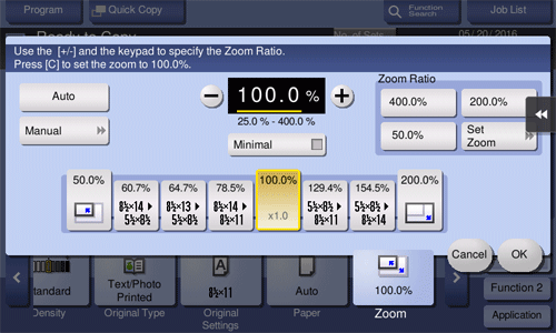 [Auto] | Tap this button to automatically make a copy with the optimal zoom ratio to match the image of the original with the paper size. This is convenient because you do not need to specify the zoom ratio. |