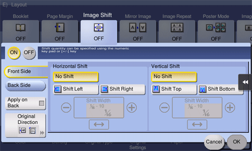 [Front Side]/[Back Side] | Adjust the image position on the print paper, by shifting the original image in horizontal or vertical direction.