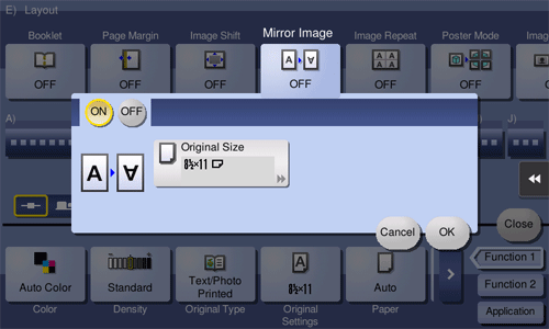 [ON]/[OFF] | Select [ON] to specify Mirror Image. |