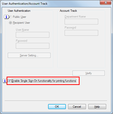 Check [Enable Single Sign-On functionality for printing functions] box, and click [OK].