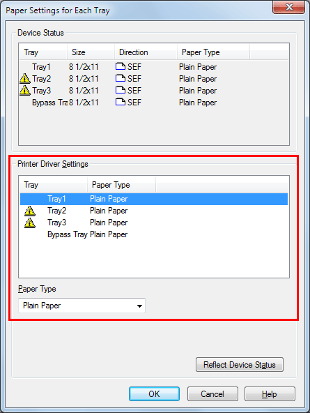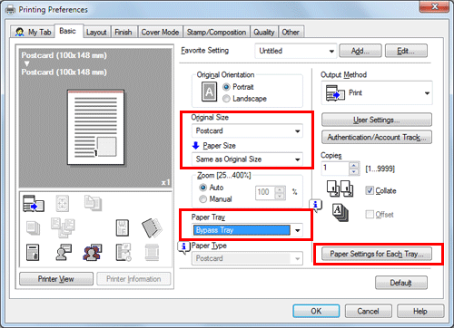 In [Paper Settings for Each Tray...] on the [Basic] tab, you can set a paper type for each tray. When you specify anything other than [Auto] in [Paper Tray], the paper type information specified here is applied.