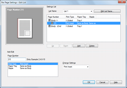 Create in advance a list that specifies the paper and print settings for each page. When printing on inserted paper, select the list you want to apply to printing.