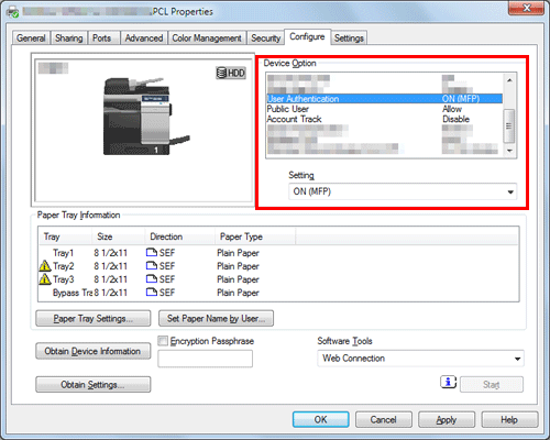 In [Device Option] in the [Configure] tab, check that the User Authentication/Account Track setting is correctly configured for your operating environment.