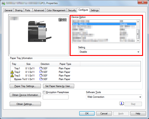 In [Device Option] in the [Configure] tab, check that the [User Authentication] and [Single Sign-On] settings are correctly configured for your operating environment.