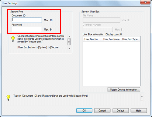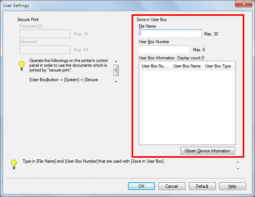 The box number can be checked in the [User Box Information] list. Clicking [Obtain Device Information] obtains the latest information of the box registered in this machine and displays it in the [User Box Information] list.