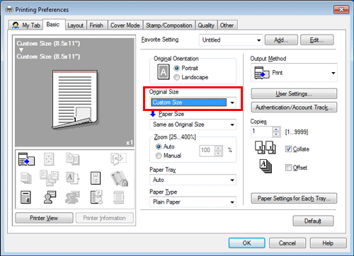 In [Paper Size] in the [Basic] tab, select the size of paper for printing. The zoom ratio is automatically determined by the paper sizes selected in [Original Size] and [Paper Size].