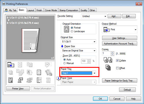 In [Paper Tray] in the [Basic] tab, select the paper tray for printing.