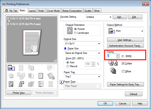In [Copies] in the [Basic] tab, specify the number of copies you want to print.