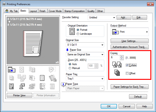 When the [Collate] check box on the [Basic] tab is selected, copies are output separately in a set-by-set manner, for example, "Pages 1, 2, 3, 4, and 5", "Pages 1, 2, 3, 4, and 5", and then "Pages 1, 2, 3, 4, and 5".