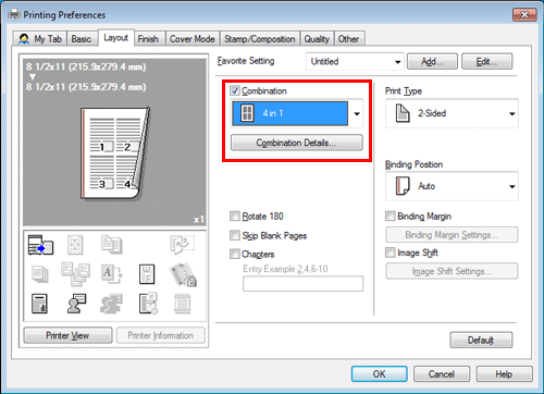 In [Combination] in the [Layout] tab, select "N in 1". For example, when you select [9 in 1], every set of nine pages is reduced and printed on the same side of one sheet.