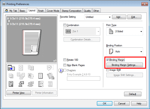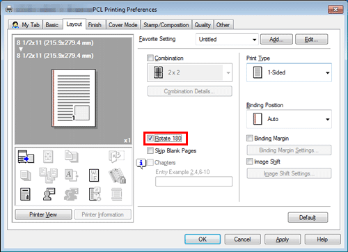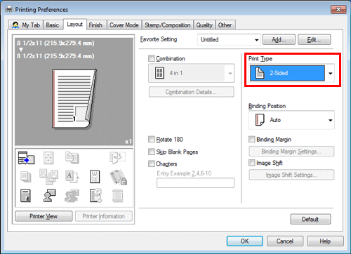 In [Print Type] in the [Layout] tab, select [2-Sided]. [2-Sided] is specified by default.