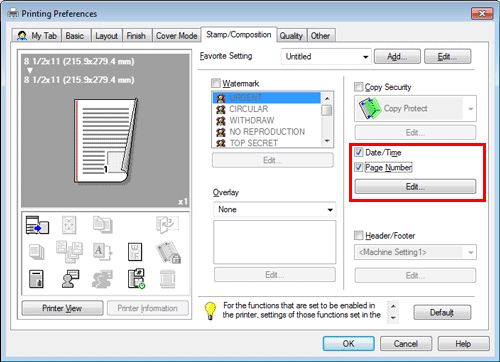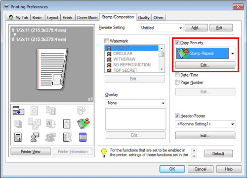 On the [Stamp/Composition] tab, select the [Copy Security] check box, and then select [Stamp Repeat].