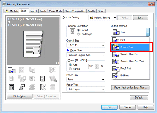 In [Output Method] on the [Basic] tab, select [Secure Print].