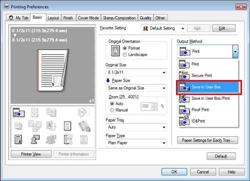 In [Output Method] in the [Basic] tab, select [Save in User Box].