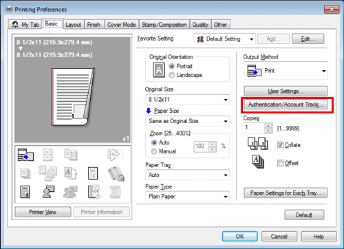 The status in which the User Authentication/Account Track setting is not configured correctly means that the [Auto] check box of [Obtain Settings...] is cleared and [User Authentication]/[Account Track] of [Device Option] is set to [None] in the [Configure] tab of the [Properties] windows of the printer driver. If a print job is executed in this status by selecting [Print] in [Output Method] of the [Basic] tab at the time of printing, it is considered as a print job without authentication information.