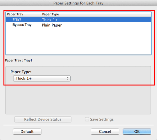 In [Paper Settings for Each Tray...], you can set a paper type for each tray. When you specify anything other than [Auto] in [Paper Tray:], the paper type information specified here is applied.