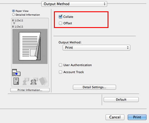When the [Collate] check box in [Output Method] is selected, copies are output in a set-by-set manner, for example, "Pages 1, 2, 3, 4, and 5", "Pages 1, 2, 3, 4, and 5", and then "Pages 1, 2, 3, 4, and 5".