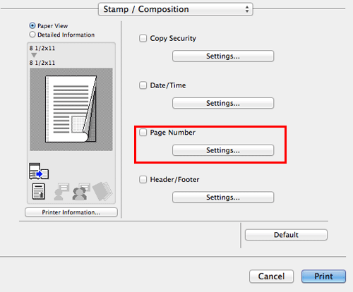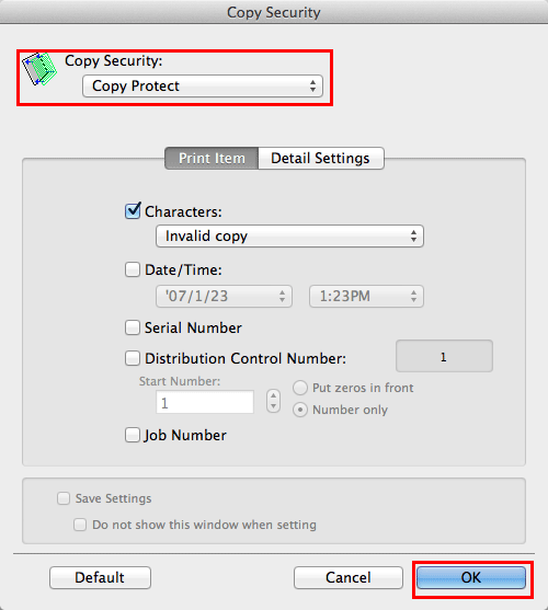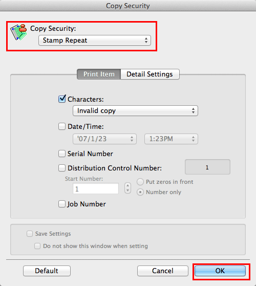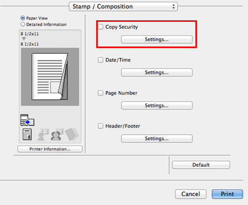 1. In [Stamp / Composition], select the [Copy Security] check box, then click [Settings...].