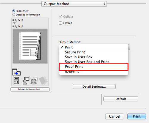 1. In [Output Method:] in the [Output Method] window, select [Proof Print].