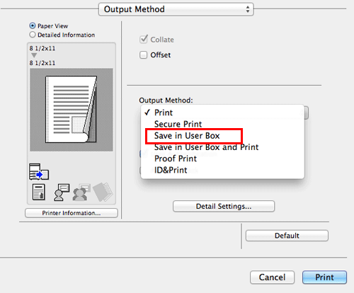 1. In [Output Method:] in the [Output Method] window, select [Save in User Box].