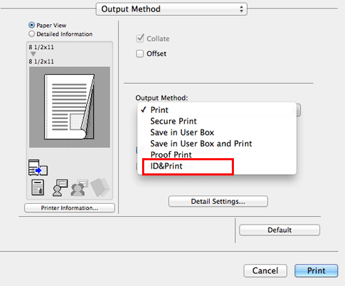 • If [ID & Print] is set to [ON] in [ID & Print Settings], a print job is considered as an ID & Print job even if [Output Method] is set to [Print] for the printer driver (default: [OFF]). For details on [ID & Print Settings], refer to Here.