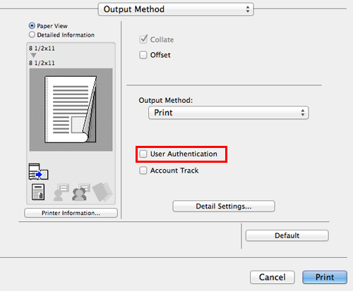 1. In the [Output Method] window, select the [User Authentication] check box (and the [Account Track] check box).