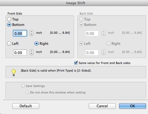 • When printing images on both sides, selecting the [Same value for Front and Back sides] check box applies the same settings to both sides.