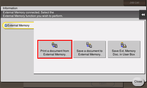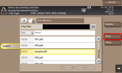 • You can also print files by selecting the User Box mode and by tapping [System] - [External Memory].