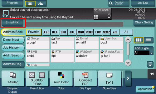 Tap [E-mail RX] to inquire the mail server. If there is an incoming E-mail, receive it and print its attachment.