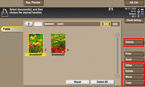 Select a file, then tap [Other] - [Save Document to MFP Shared Folder]. Now you can register files saved in the Public User Box in an SMB sharing folder.