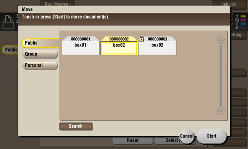 Select a file, then tap [Move]. Now you can move the file to another User Box. The destination can be a Public User Box, a Personal User Box, or a Group User Box. Select a destination User Box, then tap [Start] or press the Start key.
