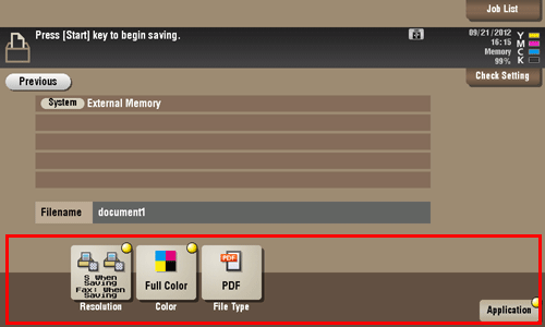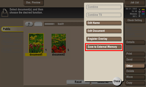 Insert a USB memory device into the USB port of this machine, select a file, then tap [Other] - [Save to External Memory]. Now you can save the file on the USB memory.