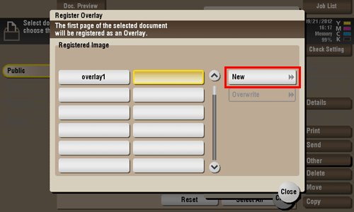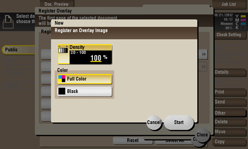Once registered, you can compose an overlay image on the original during copy or printing from the PC. Also, you can compose an overlay image onto a User Box file during file printing.