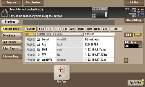 Tap [Job History], and you can select a destination from the scan or saved job history.
