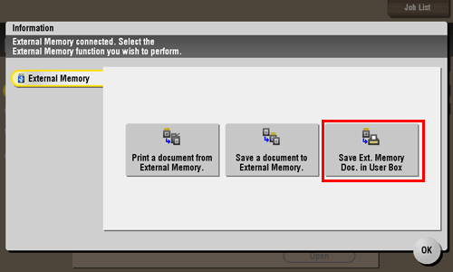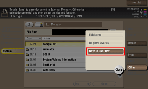 You can also print files by selecting the User Box and by tapping [System] - [External Memory].