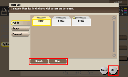 Tap [Search], and you can search for a User Box. Tap [New], and you can create a new User Box. For details, refer to Here.