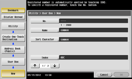 1. Tap [Utility] - [One-Touch/User Box Registration] - [Create One-Touch Destination] - [Address Book (Public)] - [User Box] - [New].